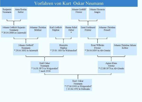 Eine eigene, familiäre Herleitung des Namens lässt sich bisher nicht ermitteln. Der Familienstamm lässt sich bisher auf Benjamin Neumann zurückführen, der um 1780 geboren sein dürfte. Seit dem Ausgang des 19. Jhdt. betreibt die Familie in Weigersdorf eine Bäckerei, die auf den Sohn Richard übergeht. Kurt Neumann, zieht mit seiner Ehefrau Helena Panig in das nur wenige Kilometer entfernte Kohlfurt und übernimmt dort ebenfalls eine Bäckerei, die er über den Krieg rettet, schlussendlich aber aufgeben muss.